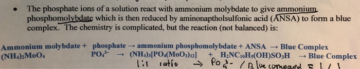 The phosphate ions of a solution react with ammonium molybdate to give ammonium phosphomolybdate which is then reduced by aminonaptholsulfonic acid. 2ml of ammonium molybdate solution. Oscillations Redox Reactions Limits and Derivatives Motion in a Plane Mechanical Properties.